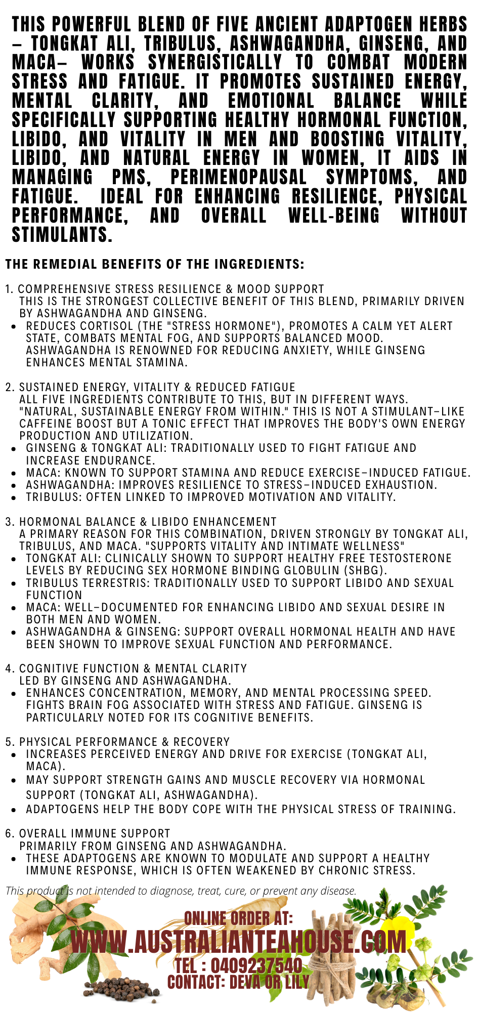 ORGANIC INGREDIENTS: Tongkat Ali, Tribulus Terrestres, Ashwagandha, Ginseng, Maca and Black Pepper